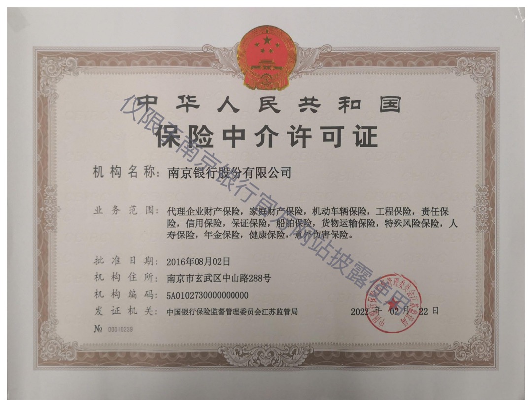 根据《中国银保监会办公厅关于换发新版许可证的通知》(银保监办法[2021]75号)要求,《南京银行股份有限公司保险兼业代理业务许可证》(许可证编号:0692770)将停用,中国银行保险监督委员会江苏监管局已于近日批准我行换发申请,并向我行颁发《南京银行股份有限公司保险中介许可证》(许可证编号:00010239)。