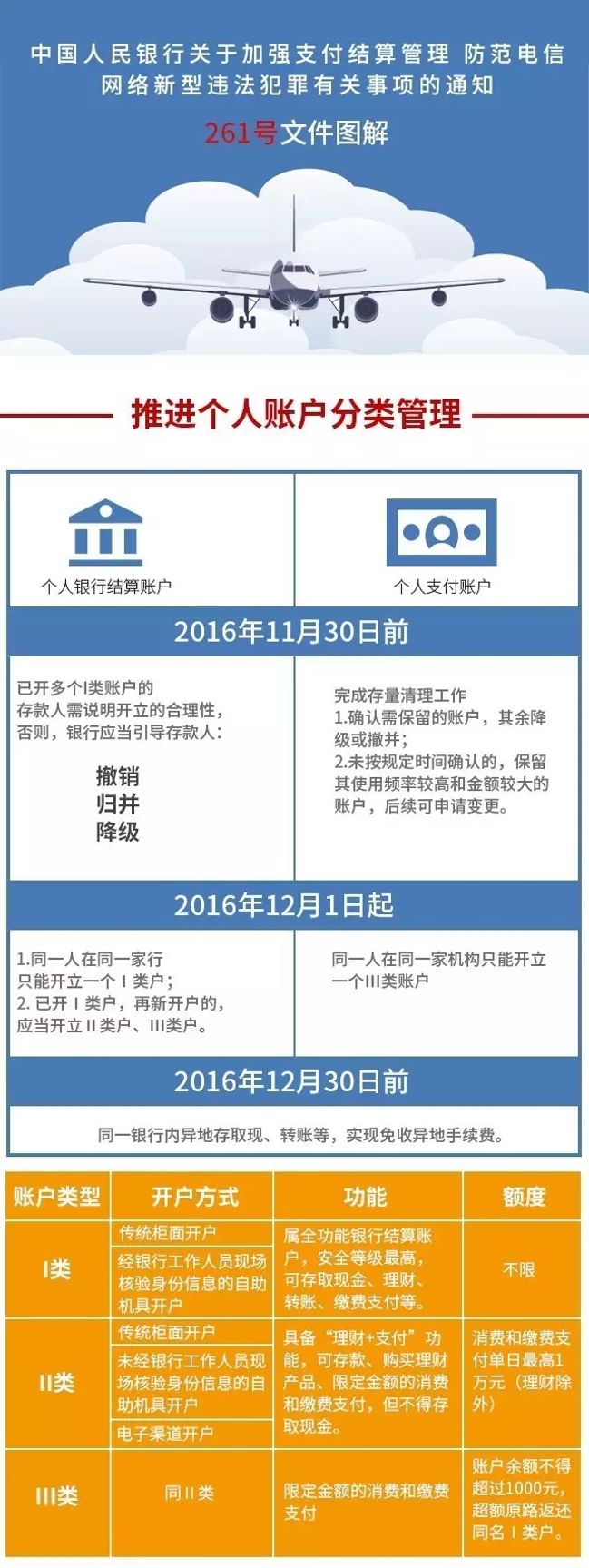 1.个人银行结算账户。自2016年12月1日起,银行业金融机构(以下简称银行)为个人开立银行结算账户的,同一个人在同一家银行(以法人为单位,下同)只能开立一个Ⅰ类户,已开立Ⅰ类户,再新开户的,应当开立Ⅱ类户或Ⅲ类户。银行对本银行行内异地存取现、转账等业务,收取异地手续费的,应当自本通知发布之日起三个月内实现免费。