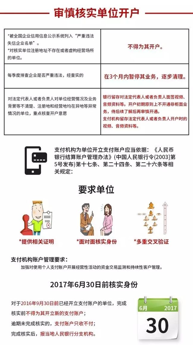 支付机构为单位开立支付账户,应当参照《人民币银行结算账户管理办法》(中国人民银行令〔2003〕第5号发布)第十七条、第二十四条、第二十六条等相关规定,要求单位提供相关证明文件,并自主或者委托合作机构以面对面方式核实客户身份,或者以非面对面方式通过至少三个合法安全的外部渠道对单位基本信息进行多重交叉验证。对于本通知发布之日前已经开立支付账户的单位,支付机构应当于2017年6月底前按照上述要求核实身份,完成核实前不得为其开立新的支付账户;逾期未完成核实的,支付账户只收不付。支付机构完成核实工作后,将有关情况报告法人所在地人民银行分支机构。