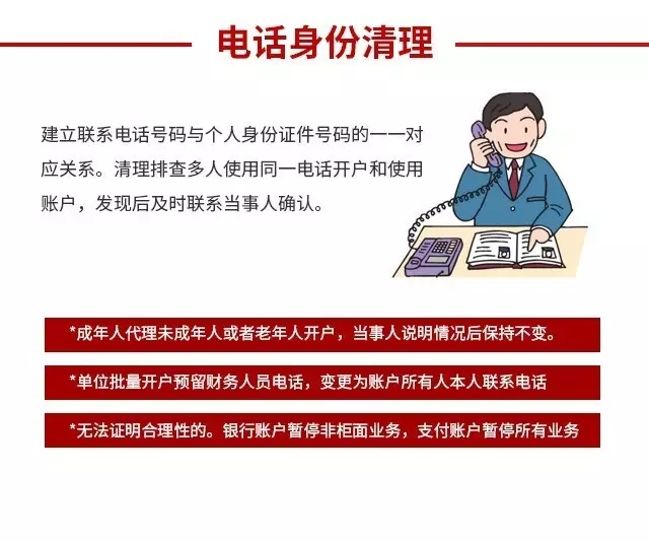 (七)严格联系电话号码与身份证件号码的对应关系。银行和支付机构应当建立联系电话号码与个人身份证件号码的一一对应关系,对多人使用同一联系电话号码开立和使用账户的情况进行排查清理,联系相关当事人进行确认。对于成年人代理未成年人或者老年人开户预留本人联系电话等合理情形的,由相关当事人出具说明后可以保持不变;对于单位批量开户,预留财务人员联系电话等情形的,应当变更为账户所有人本人的联系电话;对于无法证明合理性的,应当对相关银行账户暂停非柜面业务,支付账户暂停所有业务。