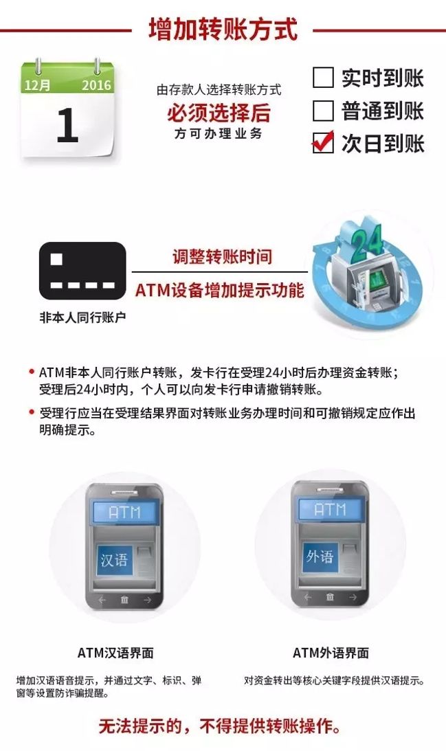 (八)增加转账方式,调整转账时间。自2016年12月1日起,银行和支付机构提供转账服务时应当执行下列规定: