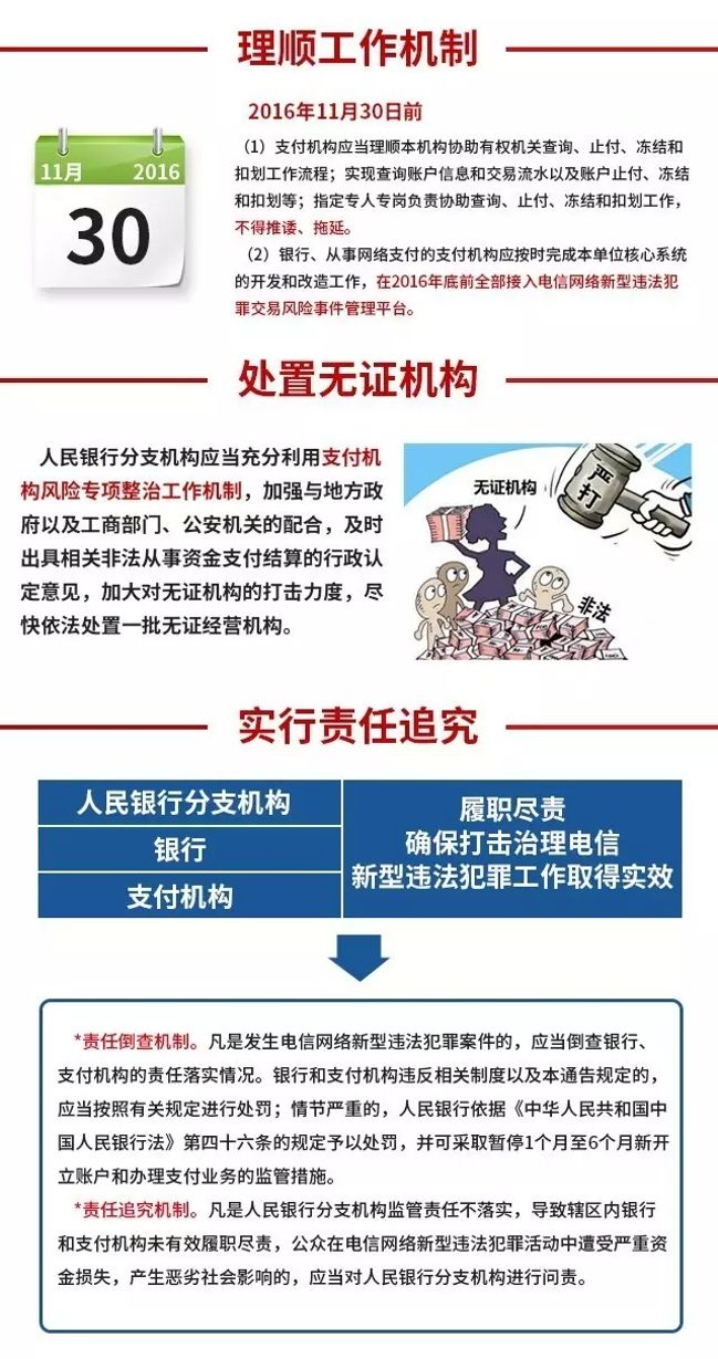 (十八)理顺工作机制,按期接入电信网络新型违法犯罪交易风险事件管理平台。2016年11月30日前,支付机构应当理顺本机构协助有权机关查询、止付、冻结和扣划工作流程;实现查询账户信息和交易流水以及账户止付、冻结和扣划等;指定专人专岗负责协助查询、止付、冻结和扣划工作,不得推诿、拖延。银行、从事网络支付的支付机构应当根据有关要求,按时完成本单位核心系统的开发和改造工作,在2016年底前全部接入电信网络新型违法犯罪交易风险事件管理平台。