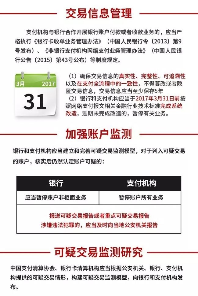 (十五)确保交易信息真实、完整、可追溯。支付机构与银行合作开展银行账户付款或者收款业务的,应当严格执行《银行卡收单业务管理办法》(中国人民银行令〔2013〕第9号发布)、《非银行支付机构网络支付业务管理办法》(中国人民银行公告〔2015〕第43号公布)等制度规定,确保交易信息的真实性、完整性、可追溯性以及在支付全流程中的一致性,不得篡改或者隐匿交易信息,交易信息应当至少保存5年。银行和支付机构应当于2017年3月31日前按照网络支付报文相关金融行业技术标准完成系统改造,逾期未完成改造的,暂停有关业务。